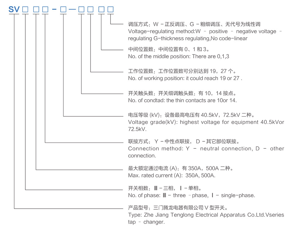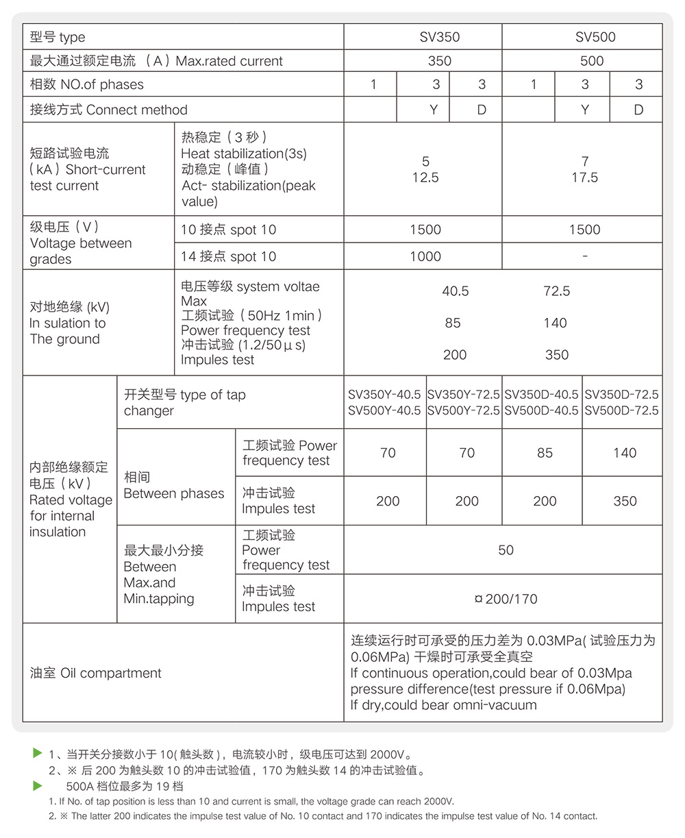 SV series tap-changer,there-phase ,maximum rated current 350A,neutral connect ,highest voltage for equipment is 72.5kV,1 Ocontacts for thin - regulating,1 9working positing,3 middle - postion,with conversion selector, positive - negative regulating.