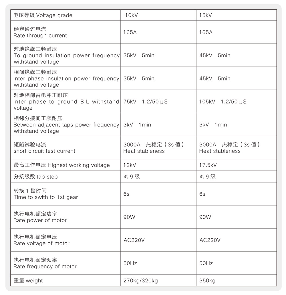 This type of changer is suitable for regulation of dry-type transformer with frequency of 50Hz,highest rated through current of 165A,voltage grade of 1 0kV,1 5kV and widely used for transmission and distribution power system of power station, transportation, building, subways, national defense, hotels, residential etc.