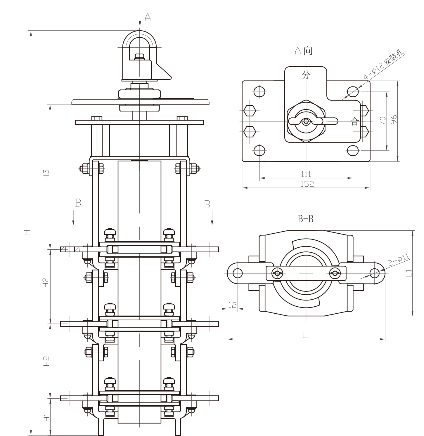 開(kāi)關(guān)外形安裝尺寸圖(電動(dòng)操作在開(kāi)關(guān)型號后加D).如35kV兩工位電動(dòng)操作型號為BFY312-35/630-20-D: