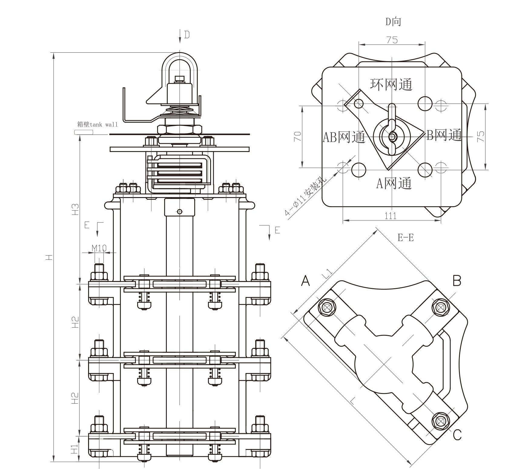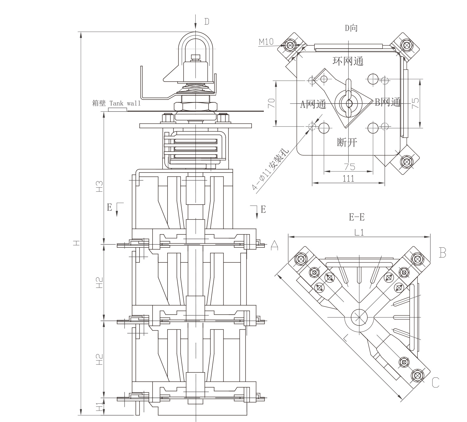 本開(kāi)關(guān)應用于組合式變壓器,負荷開(kāi)關(guān)有四位置和二位置開(kāi)關(guān),四位置開(kāi)關(guān)按結構形式不同可分為丁型、V型和}型。開(kāi)關(guān)安裝在組合變壓器的箱壁上,以變壓器油為絕緣和滅弧介質(zhì),適用于頻率50日z,設備最高電壓12kV, 40.5kV,額定電流315A, 630A三相供電線(xiàn)路,在終端供電或環(huán)網(wǎng)供電系統中,作為工業(yè)、民用電能的控制和保護裝置。在操縱桿的作用下,能使開(kāi)關(guān)在組合式變壓器帶負荷狀態(tài)下,作三相聯(lián)動(dòng)關(guān)、合電源或改變供電方式。