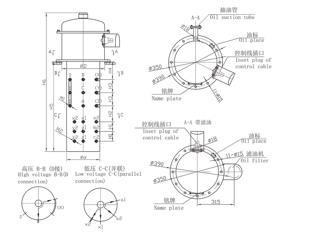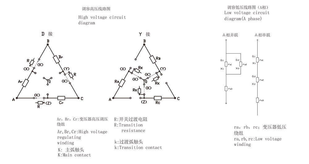 3調容方式:高壓,星、角轉換;低壓,串、并聯(lián) Capacity regulation method: HV(A-Y); LV(series-parallel connection)