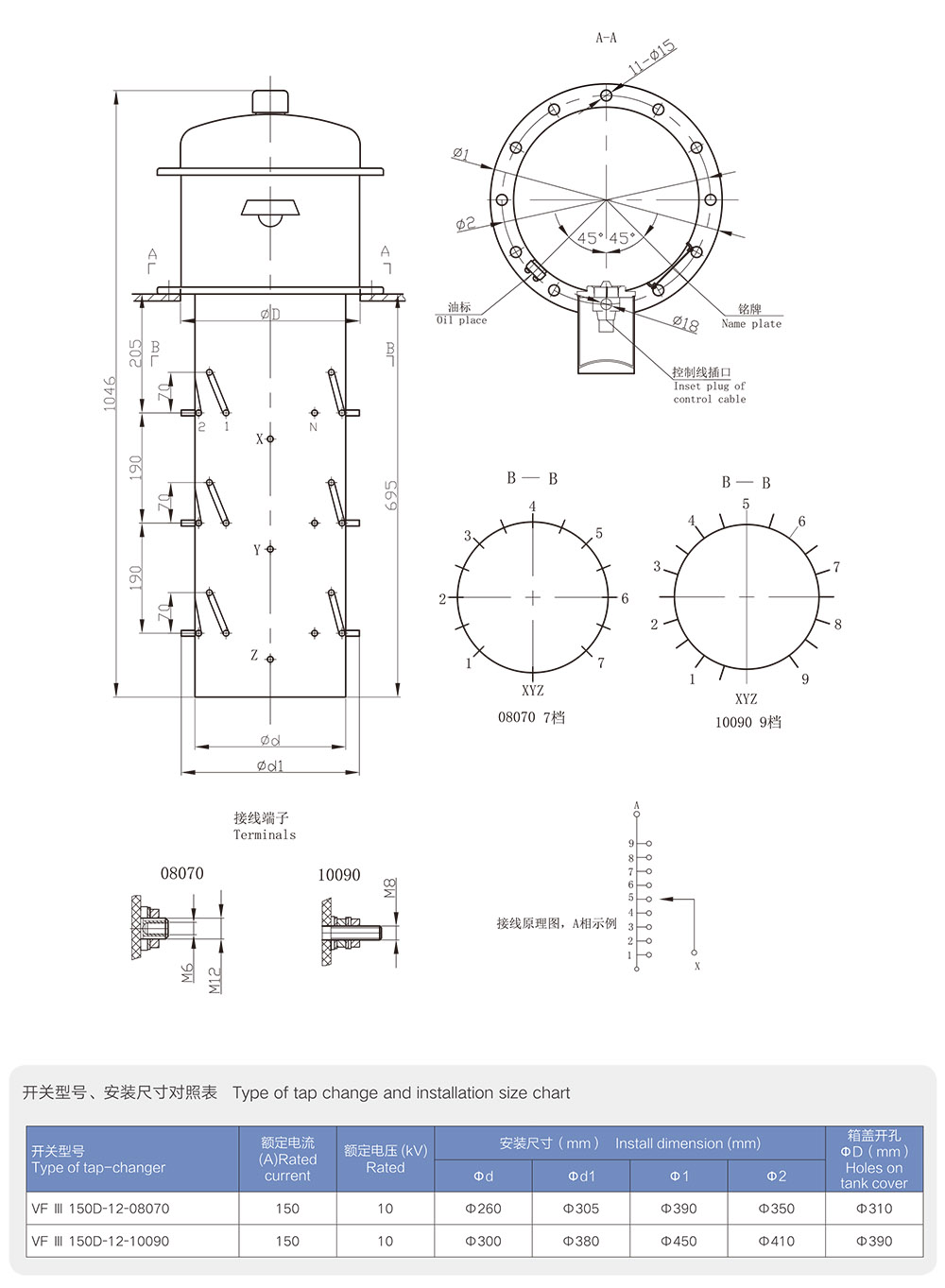 VF III 400D-12-10090 Type of tap-changer and Install dimension